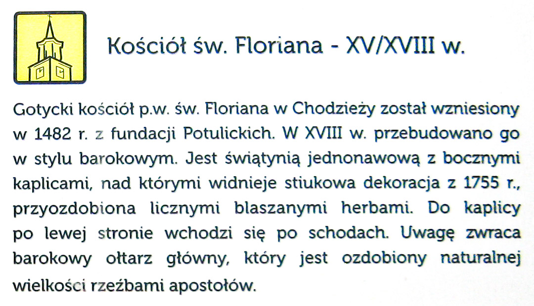 „Gotycki kościół p.w. św. Floriana w Chodzieży został wzniesiony w 1482 r. z fundacji Potulickich. W XVIII w. przebudowano go w stylu barokowym. Jest świątynią jednonawową z bocznymi kaplicami, nad którymi widnieje stiukowa dekoracja z 1755 r. , przyozdobiona licznymi blaszanymi herbami. Do kaplicy po lewej stronie wchodzi się po schodach. Uwagę zwraca barokowy ołtarz główny, który jest ozdobiony naturalnej wielkości rzeźbami apostołów” – opis z miejskiej tablicy informacyjnej.